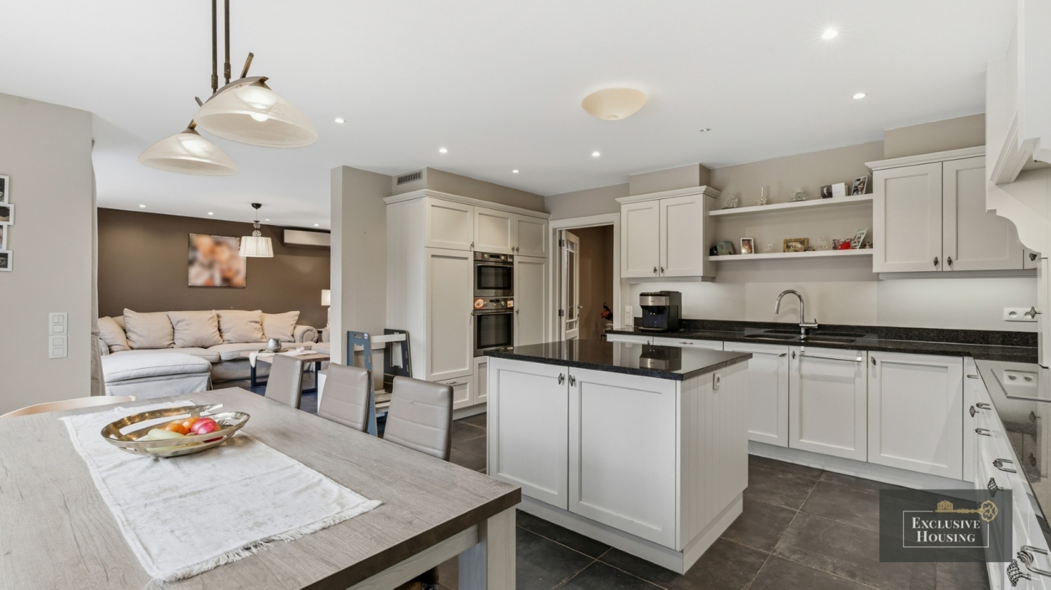 De stijlvolle inkom- en traphal met gastentoilet leidt enerzijds naar een gelijkvloerse bureau/slaapkamer en anderzijds naar de aangename ruime en lichtrijke leefruimte voorzien van natuursteen vloer en een groot schuifraam als mooie verbinding met de tuin. Aansluitend bevindt zich de ruime hyper-geïnstalleerde eetkeuken uitgerust met een royaal werkeiland met kasten, een inductiekookplaat, dampkap, nieuwe Miele-vaatwasser, combi-oven, microgolfoven, nieuwe ingebouwde koelkast, dubbele spoelbak en een granieten werkblad. Ook vanuit de keuken is er maximale verbinding met de tuin dankzij een groot raam.