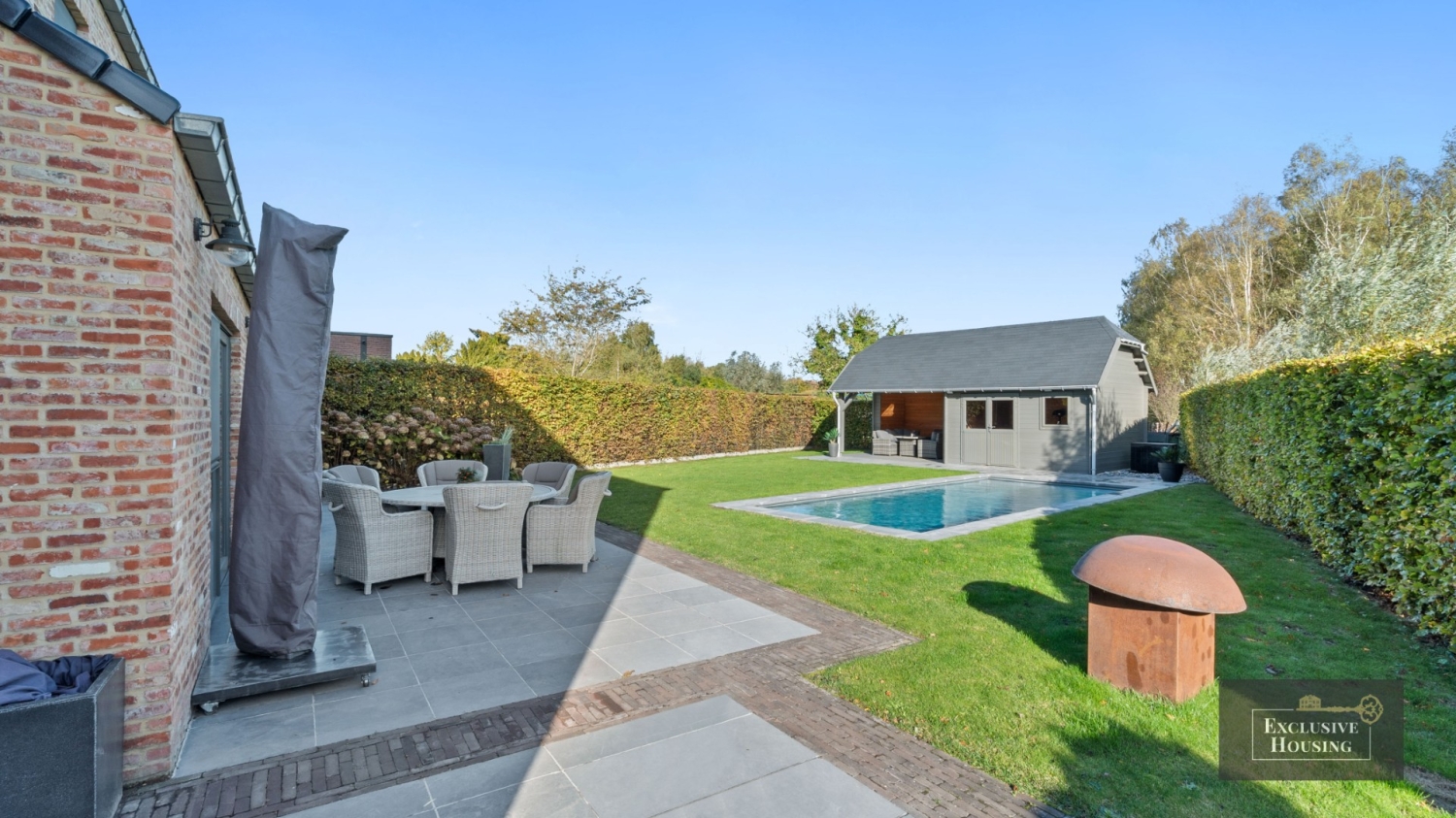 Het verwarmde zwembad (3 m × 8 m, d 1,5 m) is uitgerust met een ingewerkte trap en plage, warmtepomp, automatisch rolluik en zwembadrobot. Poolhouse met zandfilter, automatisch doseringssysteem en overdekt lounge gedeelte. Tuin afgesloten door draadafspanning en levende hagen. 2 poortjes vooraan. Mooie verzorgde voortuin met meerdere autostaanplaatsen.