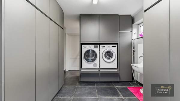 Praktische en doordacht ingerichte berging met ingebouwde kasten, buitendeur, uitgietbak en ruimte voor Amerikaanse koelkast/diepvriezer en wasmachine & droogkast op hoogte. Aparte inloopdouche, ideaal ifv zwembad. Aansluitend inpandige garage met elektrische sectionaalpoort en regenwaterpomp.